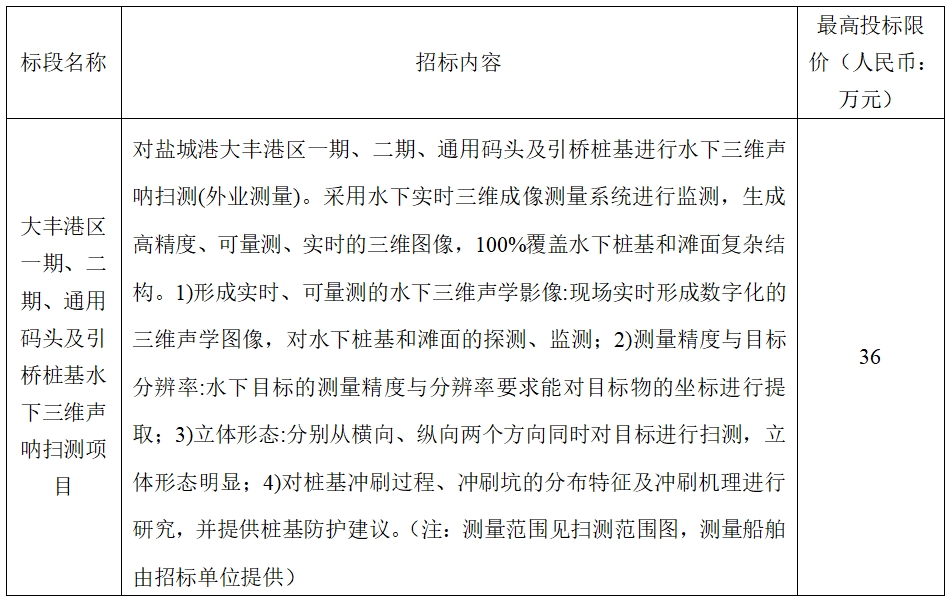 (5)項(xiàng)目標(biāo)段劃分:大豐港區(qū)一期、二期、通用碼頭及引橋樁基水下三維聲吶掃測(cè)項(xiàng)目共劃分1個(gè)標(biāo)段,標(biāo)段信息如下: