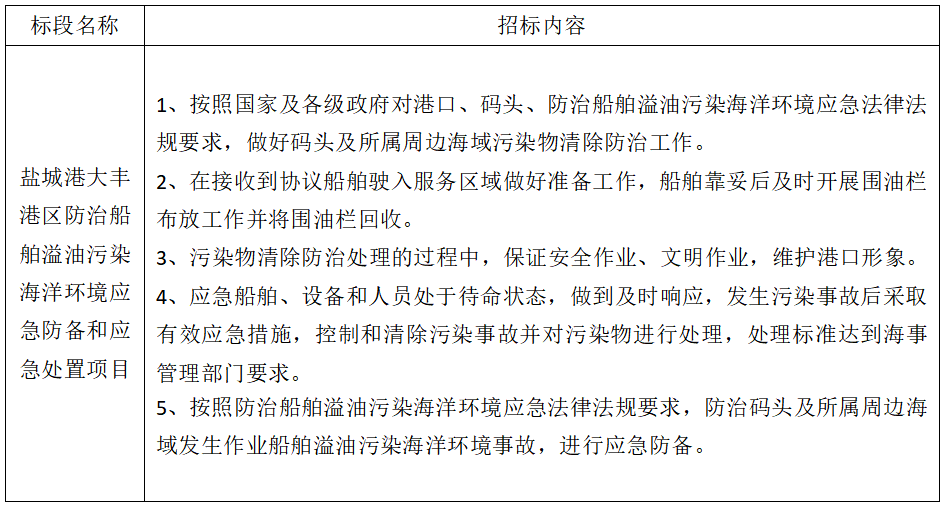 1、項(xiàng)目名稱:鹽城港大豐港區(qū)防治船舶溢油污染海洋環(huán)境應(yīng)急防備和應(yīng)急處置項(xiàng)目