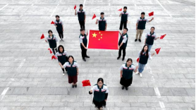 右圖:團員與國旗合影