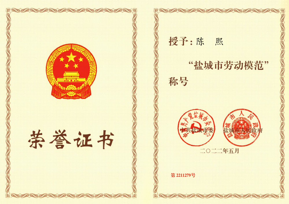 喜報丨集團陳熙同志榮獲“鹽城市勞動模范”稱號