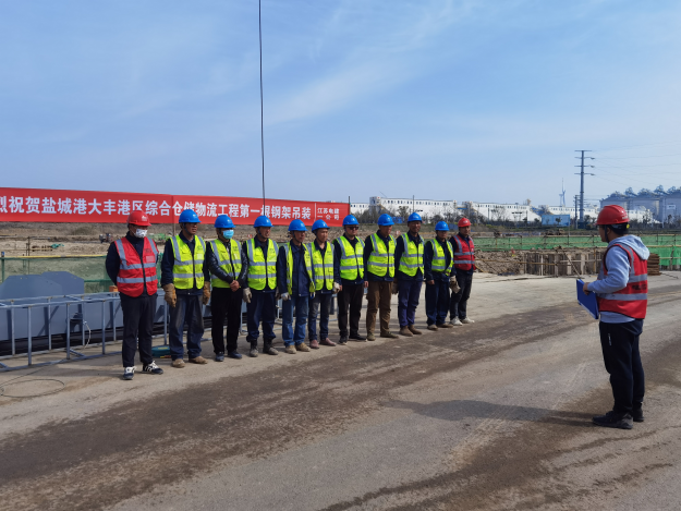 在機械及司號聲中,第一根預制鋼架被徐徐吊起,穩穩地安裝在承臺基礎上,由項目咨詢公司代管的大豐港綜合倉儲物流項目鋼結構工程首吊成功完成,標志著該項目正式進入安裝施工階段,開啟建設新篇章。