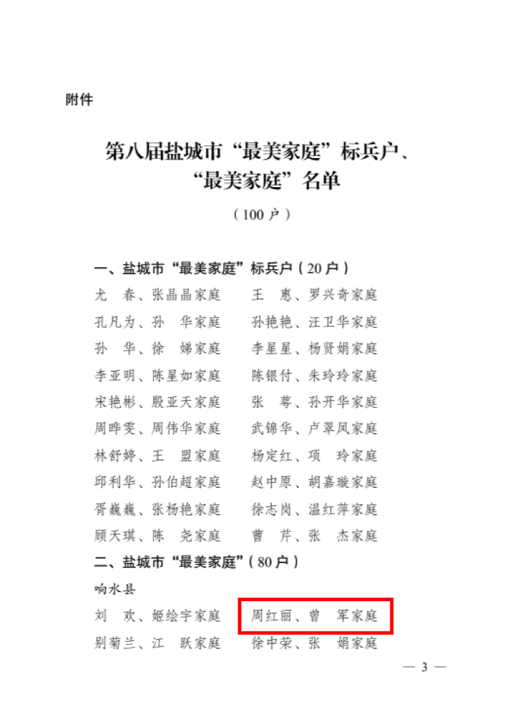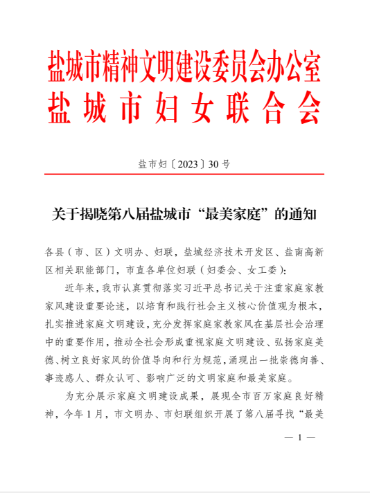 近日,從鹽城市婦女聯(lián)合會傳來好消息,在市第八屆鹽城市“最美家庭”評選活動中,鹽城港響水港區(qū)曾軍家庭榮獲鹽城市“最美家庭”稱號。