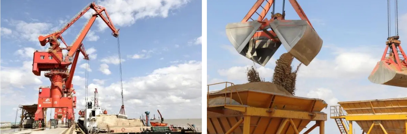 紅色的門機(jī)下行駛著來來往往的貨車,紅色的漏斗等著他一次次的閉合