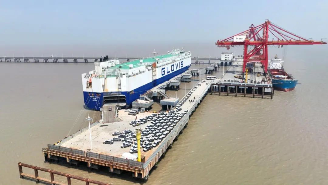 2023年5月28日清晨,2545臺悅達(dá)起亞商品車在鹽城港大豐港區(qū)順利完成集港,并啟運(yùn)發(fā)往中東、南美、非洲等地。(蔣雷 攝)