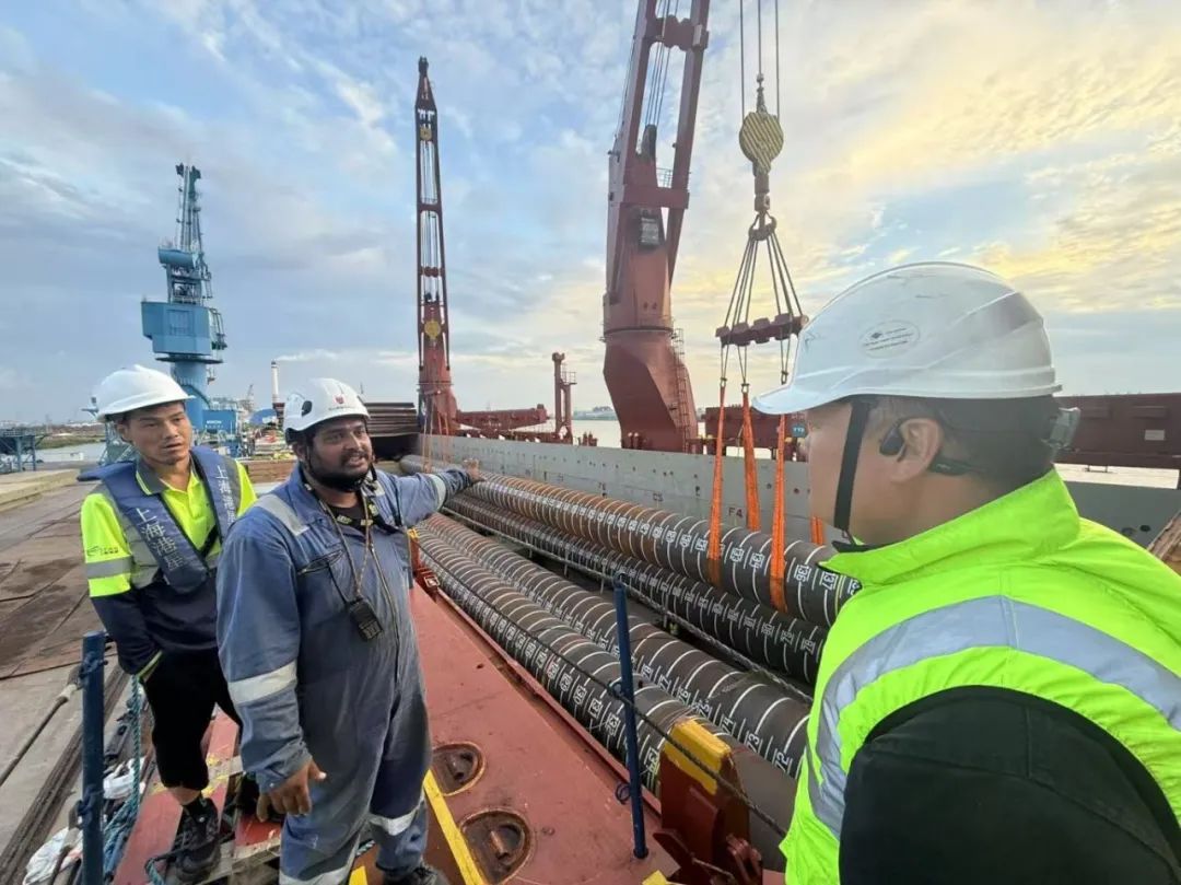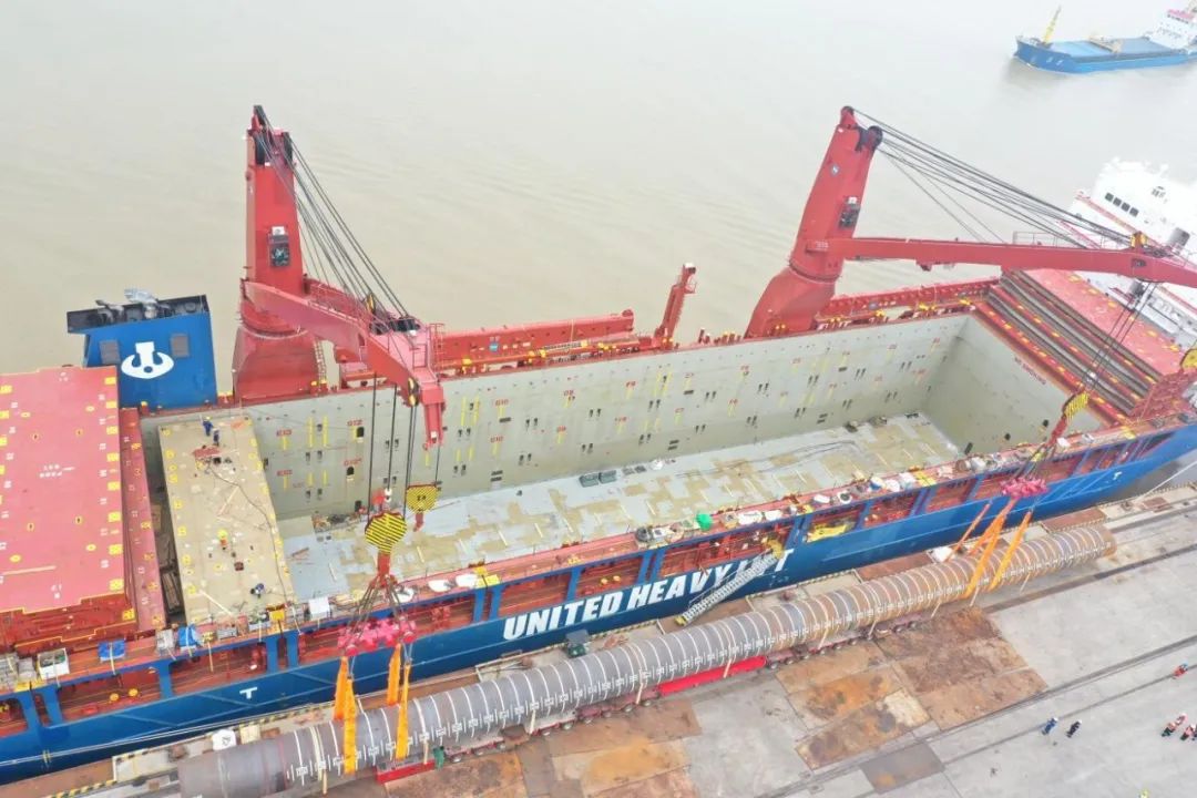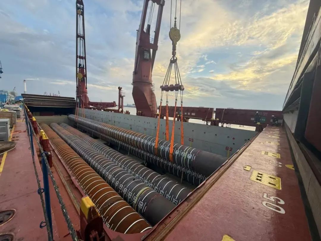 “幸福號”貨輪承載著江蘇天能海洋重工有限公司精心制造的尖端管樁裝備,這些“大國重器”將遠赴中東,為當地油氣資源開發(fā)提供關鍵基礎設施支持。全船共裝載45件管樁及配套鋼結構,其中管樁長度普遍超過40米,最長達76.8米,單件最大重量突破377噸,堪稱“海上鋼鐵巨龍”。