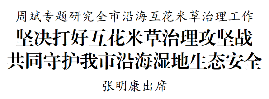 5月23日下午,市委書記周斌專題研究全市沿海互花米草治理工作。他強調,要深入貫徹習近平總書記關于互花米草防治的重要批示精神,認真落實國家和省相關部署要求,堅持把互花米草治理作為促進人與自然和諧共生的重大政治任務,深入開展專項行動,堅決守護好沿海生物多樣性和濕地生態系統安全。市委副書記、代市長張明康出席。